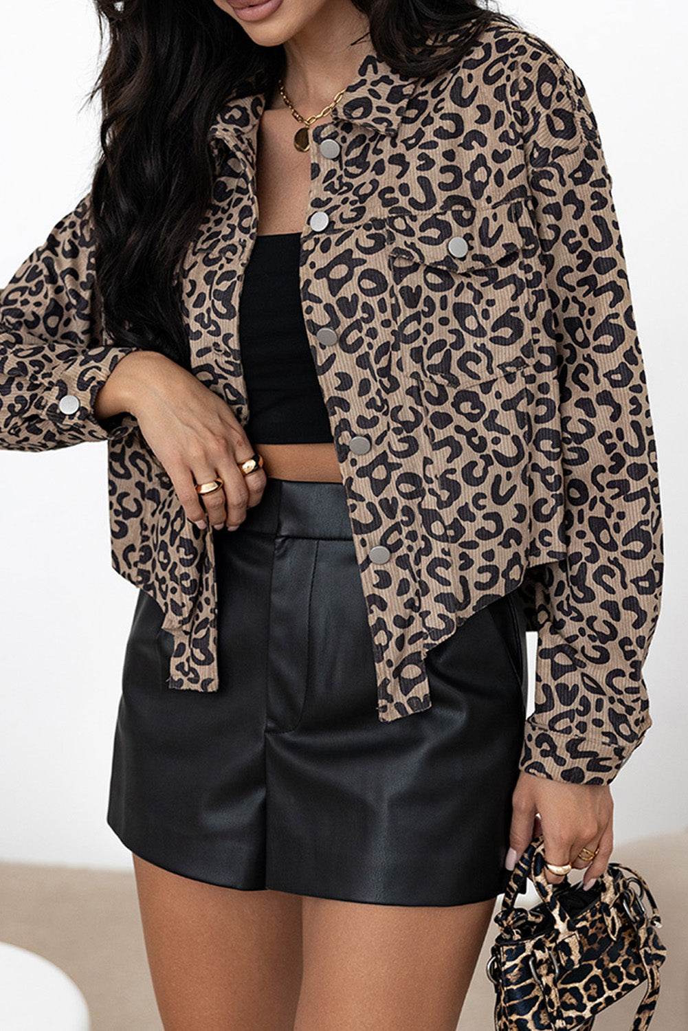 Dark Khaki Leopard Print Corduroy Irregular Hem Buttoned Jacket