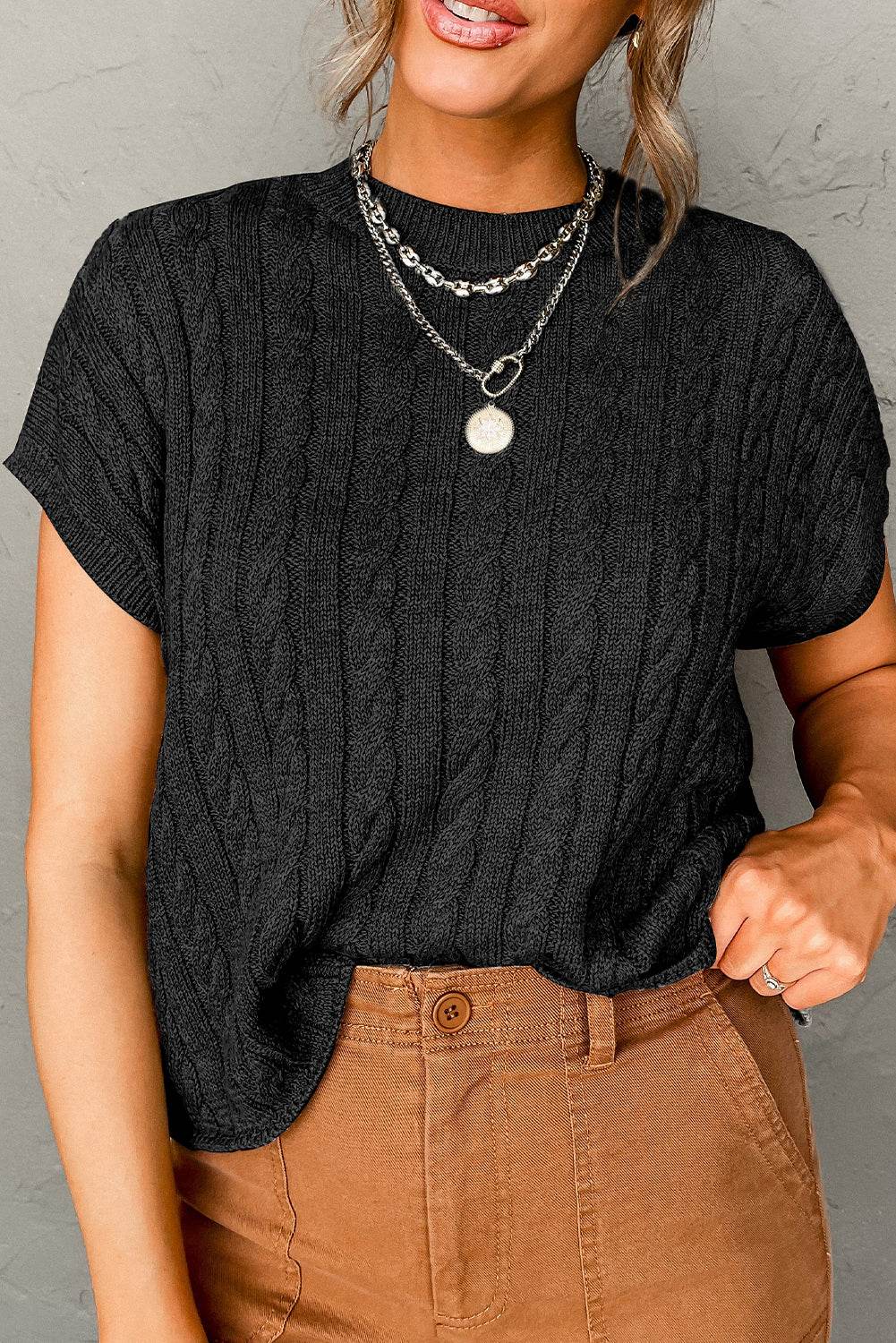 Black Crew Neck Cable Knit Short Sleeve Sweater